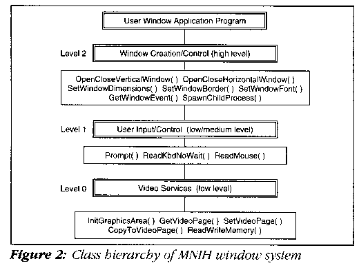 Figure 2 illustrates a proposed class hierarchy of the MNIH Window System. (Note: A more complete MNIH implementation could require as few as 50 or as many as several hundred level 0 and level 1 functions. The numbers depend on the window modes of operation -- text-based versus bit-mapped -- and the level of window sophistication desired.)