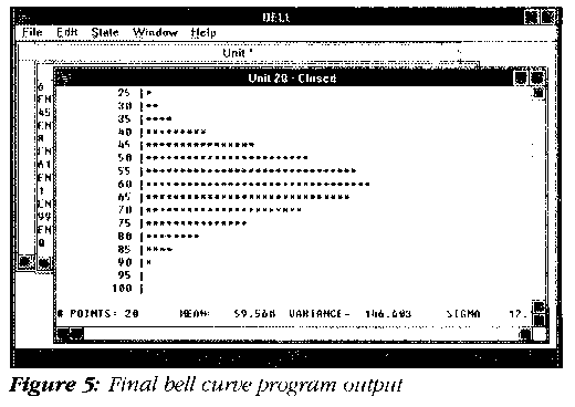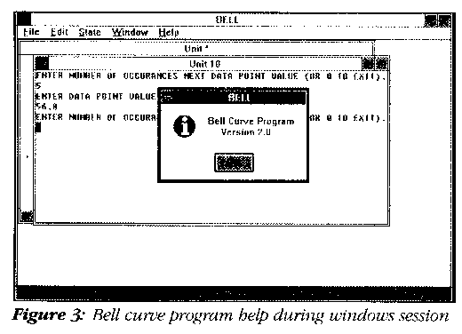 These figures represent the result of windows interface modifications made to allow the bell curve program to execute in a Microsoft Windows 3.0 environment! The code used fits the patterns suggested earlier but with the addition of less than ten additional lines of source code! Compare this small effort to that of implementing the remainder of the MNIH low-level routines, especially if you are not already comfortable with C or assembler.