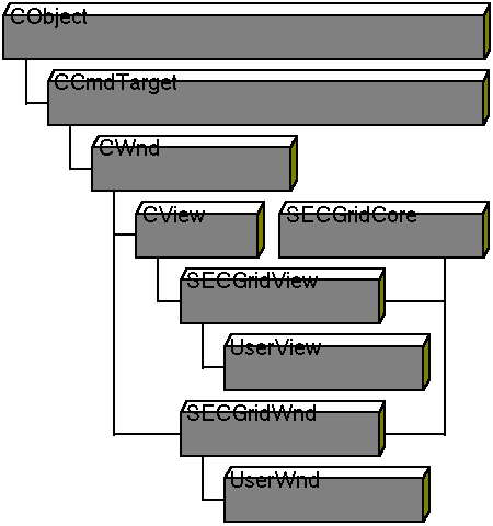 Class SECGridWnd provides SECGridCore with an interface so that it can be used like a control (placed in a dialog and manipulated with the Visual C++ dialog editor). Like CWnd, SECGridWnd is rarely instantiated. Instead, you derive a class from SECGridWnd, override the virtual functions to obtain the desired behavior, and instantiate the derivative. The SECGridView class provides CView features such as splitter-window support, printing, and print preview. Like SECGridWnd, it is also usually used only as a base class and not directly instantiated.