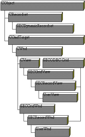 Figure 4 shows the hierarchy of the ODBC grid classes. SECODrid provides the basic functionality to display the records of a CRecordset. Because SECODrid is not derived from CObject, it can be used as a right-hand branch in derived classes. This is the same mechanism we discussed with SECGridCore. The SECRecordWnd and SECRecordView classes inherit from SECODrid to display query results in a dialog or view grid, respectively. Additional classes are used to display the status beam in the scroll bar.
