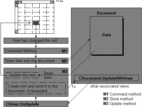 In addition to drawing in response to standard Windows paint messages, the grid also has to keep the document and views synchronized. The MFC document/view model handles most of the updating for the grid. To provide maximum flexibility, the grid provides three overridable functions in the update path. Figure 6 shows how updates are performed. You can intercept updates at the command stage, the storing stage, and even the update stage.