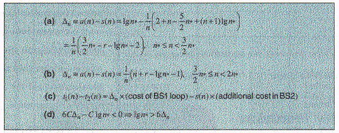 Allow the same cost C for any operation (comparison, arithmetic, or assignment) so that the two cost factors in Figure 5 (c) are nearly 6C and C (for two operations, at about half the iterations), respectively. Using only lg n*, the leading term from the solution for s(n), shows that BS1 is better when the equation in Figure 5 (d) applies.