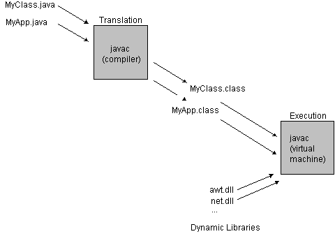 Java source is not compiled into normal machine code. It is translated into code for a virtual machine specifically designed to support Java's features. A Java interpreter then executes the translated code. No link step is required; the interpreter dynamically links in additional classes on demand; see Figure 1.