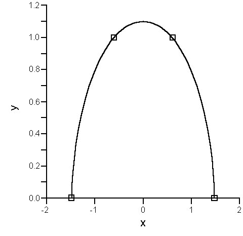 Four-point Data. The first data set is simple, consisting of the four data points plotted in Figure 2, with a polynomial interpolating curve overlaid for visual aid. Symmetry implies that a maximum is expected at an x value of 0.0 and a y value of approximately 1.1. This data set permits validation that the program can handle negative input data and solve for an extremum at an abscissa of zero. I ran the program using these data and the extremum computed were as expected: