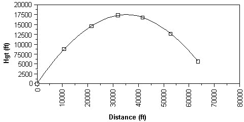 Trajectory data. The next data set is an extension of the first in that it yields a single maximum. However, this seven-point data set is derived from the equation expressing the trajectory of a projectile. Therefore, the expected abscissa and ordinate values are calculable. The data plotted in Figure 3 was hand-calculated based upon a projectile shot at 1500 feet/second at an initial angle of +45 degrees and a position sampling at 10-second intervals until ground impact.