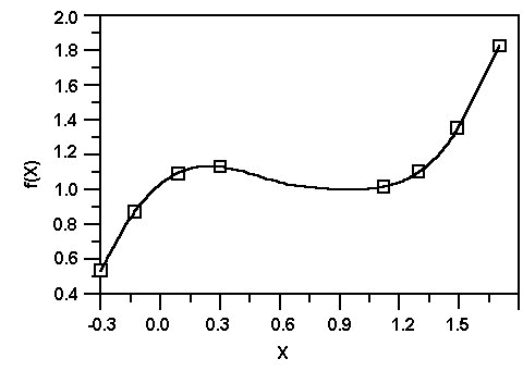 Two-Root Data. The last data I'll present provide the validation of several algorithm/software characteristics which represent a stress-test situation. These are the ability to perform with irregularly sampled and/or missing data, to find two extrema within a single interval, and to find very subtle extrema. This combination is a rare occurrence that represents a worst-case scenario. The eight-point data set depicted in Figure 5 comprises samples of the function f(x) = x3 - 2x2 + x + 1.