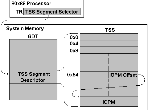 The bitmask array, called the I/O Permission bit Map (IOPM), is stored in the Task State Segment (TSS) structure in main memory, which is contained in a special segment referenced by the segment selector in the processor's Task Register (TR). The location of the IOPM within the TSS is flexible. The offset of the IOPM within the TSS is stored in a 2-byte integer at location 0x66 in the TSS; see Figure 1.