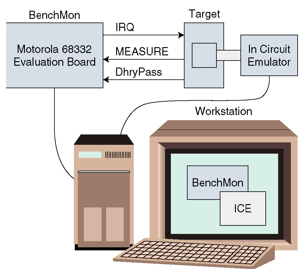 Test Target System.The target for this test series is any average microcontroller meeting the aforementioned target class assumptions. Three I/O connections to this system are required. The first is a digital "Measure" output used to indicate that the test system is ready for measurement. The second is an interrupt request (IRQ) input that will be used to invoke asynchronous interrupts. The remaining signal is a DhryPass output. Most microcontroller evaluation boards make suitable test targets.