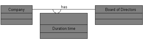 Associations can be modeled and implemented as separate objects. An association "object" in this example would contain a duration field, a pointer to a company object, and another pointer to a board of directors object.