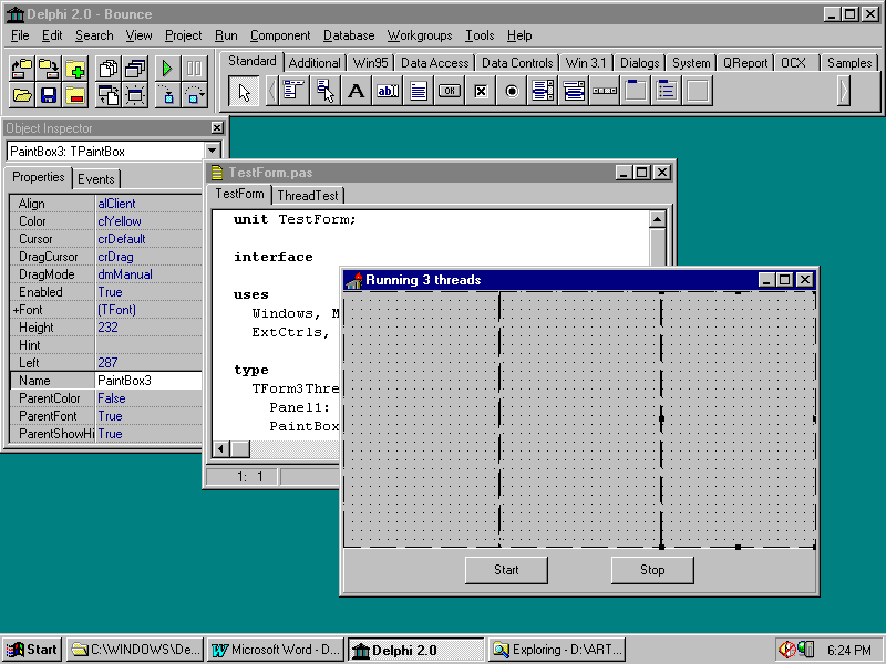 The main form creates three side-by-side regions of type TPanel, which are used as the containment boxes for the bouncing objects. The thread objects are created inside the FormCreate member, and destroyed in the FormDestroy member. These two functions are similar to regular constructors and destructors, except they are called as handlers by Delphi. The code for the main form is shown in Listing Nine.