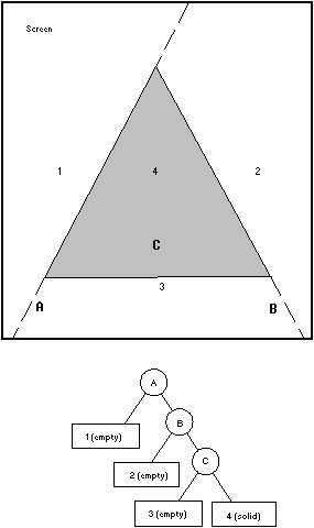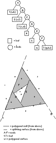 Before diving into VSD, note that each Quake level is stored as a single, huge 3-D BSP tree. This BSP tree, like any BSP, subdivides space, in this case, along the planes of the polygons. However, unlike the BSP tree I presented previously, Quake's BSP tree does not store polygons in the tree nodes, as part of the splitting planes, but rather in the empty (nonsolid) leaves, that appear unshaded in Figure 1.
