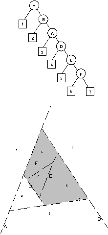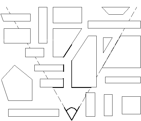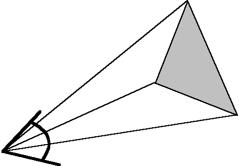 John's original Quake design was to draw front to back, using a second BSP tree to keep track of what parts of the screen were already drawn and which were still empty and therefore drawable by the remaining polygons. Logically, you can think of this BSP tree as being a 2-D region describing solid and empty areas of the screen (see Figure 4), but in fact it is a 3-D "beam tree." A beam tree is a collection of 3-D wedges (beams), bounded by planes, projecting out from some center point, in this case the viewpoint, as in Figure 5.