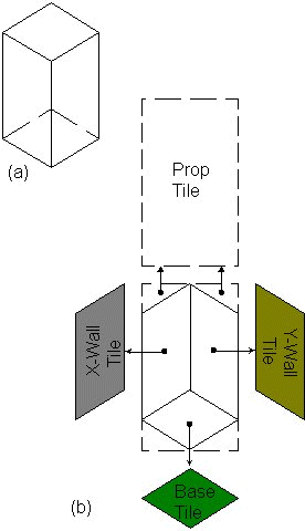 Of all the isometric possibilities, the axonometric perspective provides excellent vision clarity and allows for each cube to be easily broken down into unique components; see Figure 2(a). The multilevel, tile-based world is constructed entirely from axonometric cubes called "cell blocks." As Figure 2(b) illustrates, each cell block is composed of separate tiles: