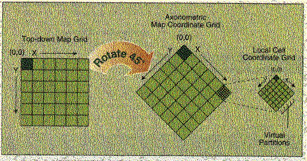 Cell blocks are arranged side-by-side on a 2-D grid, bearing a strong resemblance to a top-down tile layout. The cell-block grid, however, is rotated at 45 degrees. Now the origin of the rotated grid lies at the top-most (farthest) corner, and the x- and y-map grid axes increase downward and to the right or left, respectively, as in Figure 3. Therefore, the x-wall of each cell block is the wall players come in contact with as they traverse the grid in the x-direction; likewise for the y-wall. This Cartesian gridmap of cell blocks is referred to as "map coordinates."