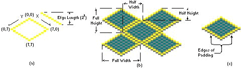 By connecting the ends of four edges to form a diamond (the base tile), a graphic representation of the local cell-coordinate grid is formed; see Figure 4(a). Subsequently, by aligning adjacent base tiles so that the edges transfer smoothly in both the x- and y-directions (no disturbance in edge slope), a graphical representation of the rotated cell-block (map) grid is created. This also reveals an extra edge of "padding" along the bottom half of each base tile; see Figure 4(c). This padding completes the design of the base tile.
