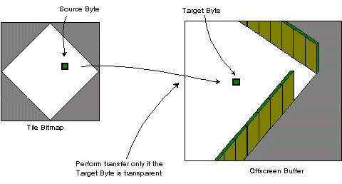 It is here that the "magic" takes place. Instead of checking each byte of the bitmap (the source byte) for transparency, the blit() function checks the corresponding byte in the off-screen buffer (the target byte) for transparency (recall that the off-screen buffer was initially filled with transparent values). If the target byte is transparent (nothing has been drawn there yet), the blit is deemed "permissible" and the function copies the source byte to the target byte, as in Figure 5. The only drawback to this method is that transparent source bytes may be needlessly copied over transparent target bytes. This drawback is negligible, however, when compared to the inefficiency of copying hundreds of tiles on top of one another. Listing Four presents the full definition of Tile::blit().
