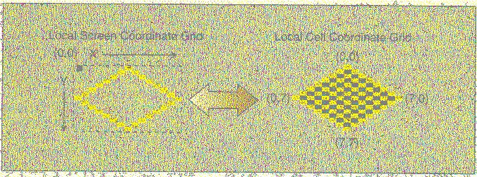 To convert from world coordinates to screen coordinates, you need to compare the local cell coordinates of a base tile with its local screen coordinates; see Figure 6. This comparison shows that a change of +1 along the cell-coordinate x-axis is equivalent to the following screen-coordinate changes: +2 in the x-direction, and +1 in the y-direction. Table 1 lists similar comparisons.