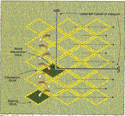 The time to render has finally come. Using the starting block as a starting point, the tiles for each cell block are drawn from left to right (according to the RPA). Each tile is drawn through a call to the appropriate Tile::blit(), after getting the tile-identification number from the appropriate tile map. After each row is drawn, the starting block is moved alternatively up and to the left and up and to the right, as in Figure 7. Once all the rows that fit into the viewport have been drawn, the process is done for the current level. The world intersection point is then adjusted for the next level down, and the main rendering process continues until all the levels have been drawn. That's all there is to it! The Axoview Engine is ready to display your worlds!