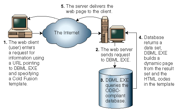 Figure 1: Cold Fusion links a web server and an ODBC-compliant database to generate dynamic, data-driven web pages.