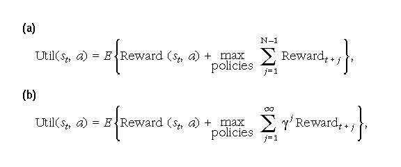 Figure 3: (a) Utility (over a finite agent lifetime), defined as the expected sum of the immediate reward and the long-term reward under the best possible policy. st is the state at time step t, Reward(st,a) is the immediate reward of executing action a in state st, N is the number of steps in the lifetime of the agent, and Rewardt is the reward at time step t. The operator E{.} stands for taking an expectation over all sources of randomness in the system; (b) utility (over an infinite lifetime), defined similarly as (a). To avoid the mathematical awkwardness of infinite sums, we introduce a discount factor, 0