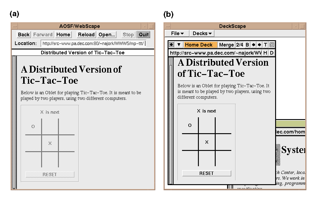 Figure 2: Oblet for playing a tic-tac-toe game at two sites. (a) WebScape browser used by player "O;" (b) DeckScape browser used by player "X."