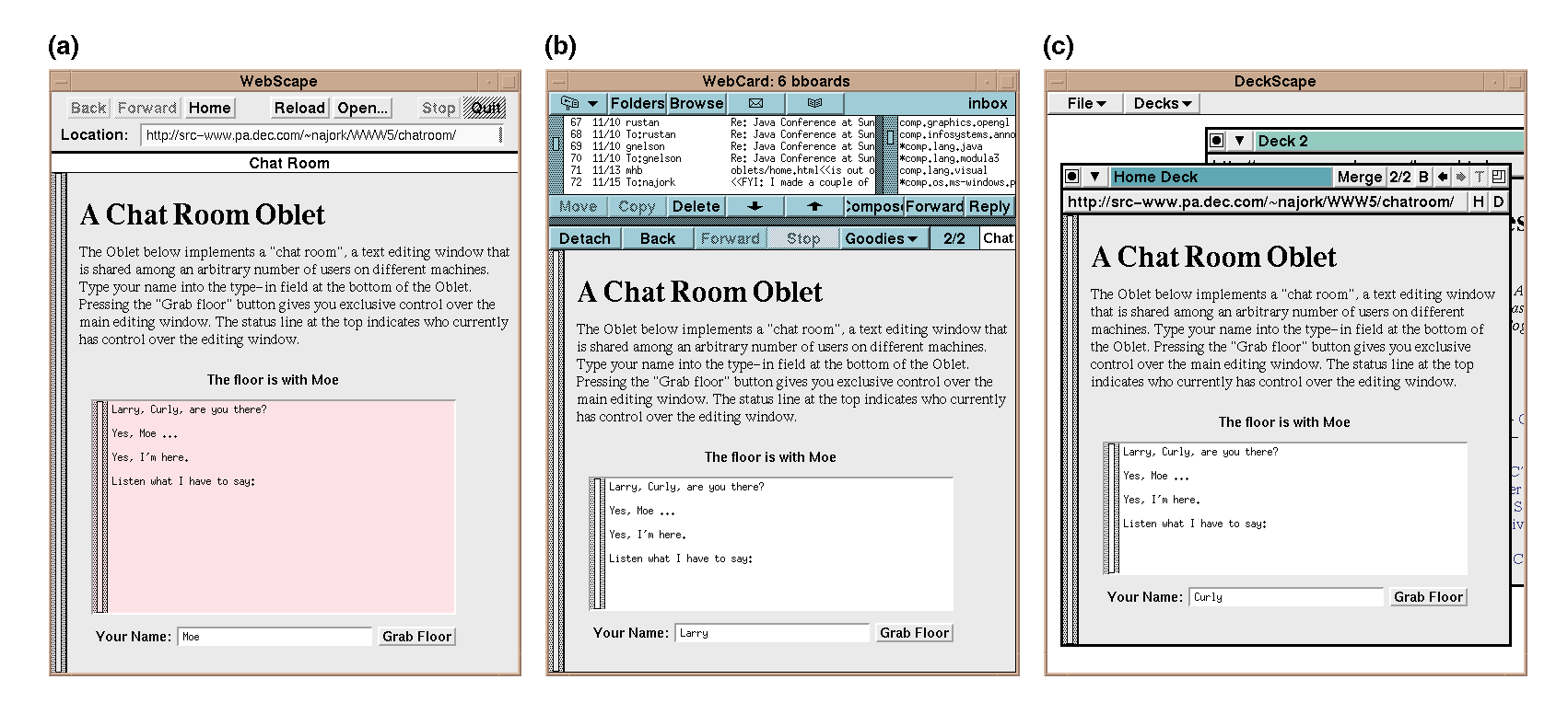 Figure 3: The chat-room Oblet running in different Oblet-enabled browsers: (a) WebScape; (b) WebCard; (c) DeckScape.