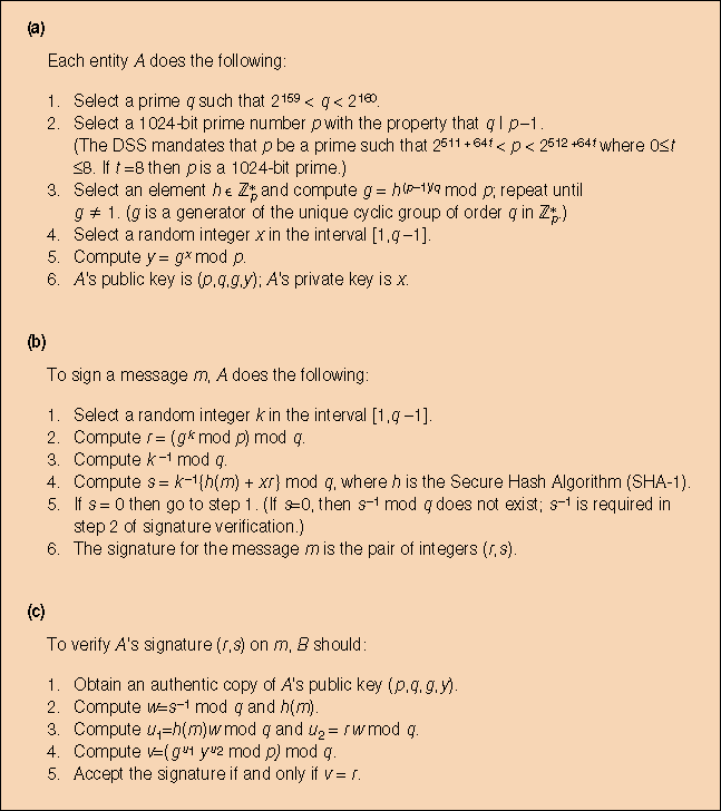 Figure 1: (a) DSA key generation; (b) DSA signature generation; (c) DSA signature verification.