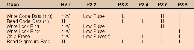 Table 2: AT89C2051 programming modes. (Note: Internal PEROM address is reset to 000H on the rising edge of RST and advanced by a positive pulse on XTAL1 pin. Chip erase requires a 10 mS pulse. P3.1 is pulled low during programming.)