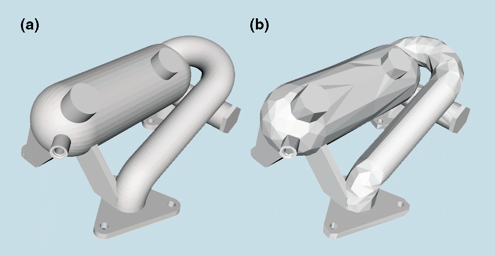 Figure 2: Decimation of a CAD part: (a) Original part shown flat shaded; (b) decimated part 83 percent reduction.