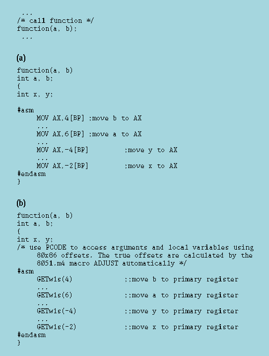 Figure 3: Code fragments to show use of assembler code in C functions: (a) 80x86; (b) 8051.