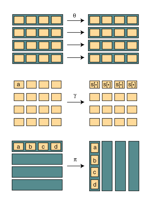 Figure 1: Geometrical representation of the basic operations of Square. It consists of four parallel linear diffusion mappings; g consists of 16 separate substitutions and p is a transposition.