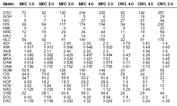 Table 5: Metric values for MFC and OWL.