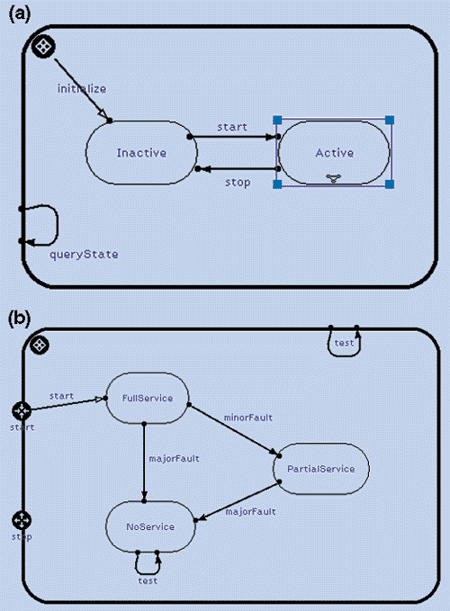 Figure 5: Adding state-machine inheritance, thereby allowing a subclass to inherit and to extend its parent's state machine; (a) active state; (b) top-level state.