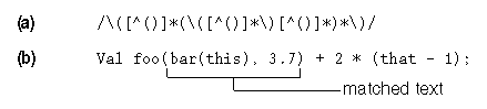 Example 1: (a) A Perl regex that matches a parenthesized expression and allows parenthesis nesting up to one level, will perform the match in the text pattern in (b).