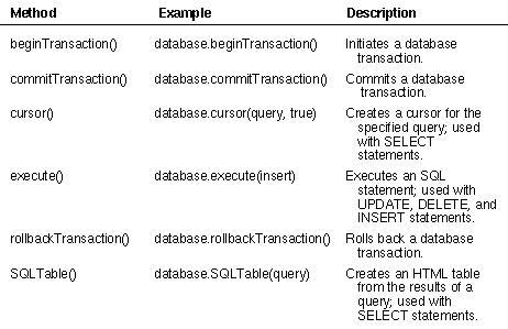 Table 3: Database methods for queries, transactions, and cursors.