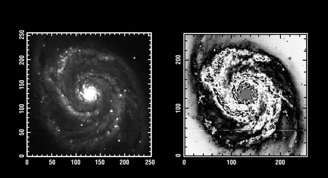 Perhaps you're getting restless at this point. Let's abandon the function calls and jump to the cool stuff. The PDL function imag() uses the PGPLOT library to display images. In Example 4(a), imag() displays the piddle $a; see Figure 1(a). It's full of stars! This is, in fact, an image of Messier 51, a spiral galaxy similar to our own but at a distance of 200,000,000,000,000,000,000 miles away, give or take a few billion. That's a bit too far for us to invade, but we can at least humiliate it, using the command in Example 4(b). This results in Figure 1(b).