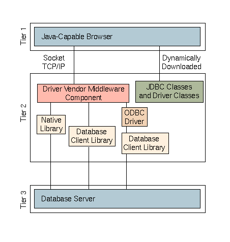 Figure 3: JDBC three-tier access using Type III driver implementation (dbAnywhere, SequeLink).