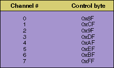 Table 2: Control byte for the eight channels with single-ended unipolar input and external clock source.