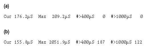 Example 2: (a) Snapshot of the timer information line while the system is otherwise idle; (b) maximum delay.