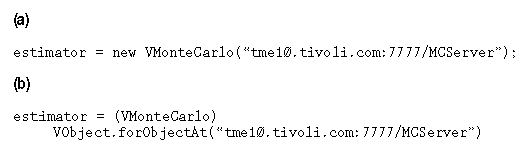 Example 1: (a) Creates an instance of the MonteCarlo class; (b) returns a reference that can be used to communicate with the remote MonteCarlo object.