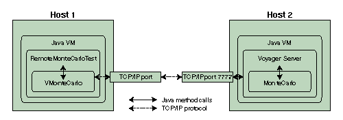 Figure 1: Interactions between the MonteCarlo client, MonteCarlo server, VMonteCarlo proxy, Voyager server, and Java environment.