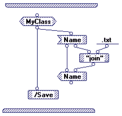 Figure 3: Prograph code fragment showing the six basic operations: Instance generator, Get, Constant, Primitive, Set, and Method Call.