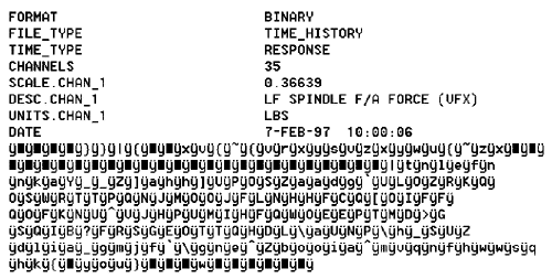 Figure 1: Sample data file. This data file has been edited to a text format. You can still see the plain ASCII header and the binary data. The token separator is the first nonstandard ASCII character.