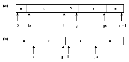 Figure 3: (a) Bentley-McIlroy three-way partitioning uses a counterintuitive loop invariant; (b) state of array after loop terminates.