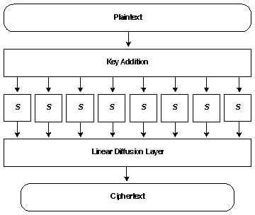 Figure 1: One round of SHARK, a block cipher with the uniform transformation structure. The nonlinear layer is implemented with eight parallel S-boxes.