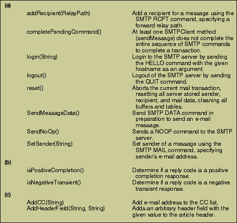 Table 1: Partial list of ORO e-mail class methods. (a) SMTPClient; (b) SMTPReply; (c)