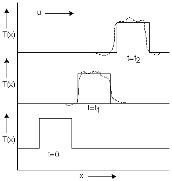 Figure 2: One-dimensional advection using finite differences shown at several different times. Exact solution is given by a solid line, the finite difference solution is dashed. Flow is to the right.