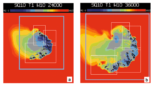 Figure 4: Plot of a simulated line of thunderstorms using an adaptive grid cloud model. The plotted domain is 400×300 kilometers. The color image depicts the surface temperature field, where red colors mean warm air and blue cold air. The black contours are the individual thunderstorms within the line. Overlaid rectangles are the adaptive grid meshes automatically placed by the driver/management module during the integration. The outer grid has a grid spacing of 18 kilometers, the blue-gray rectangle indicates the 6-kilometer grid mesh, and the inner white rectangles are the 2-kilometer meshes. (a) Simulation at 6.6 hours; (b) simulation at 10 hours.