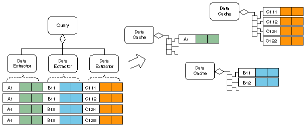 Figure 13: Restructuring a relational result set and eliminating redundant entries.