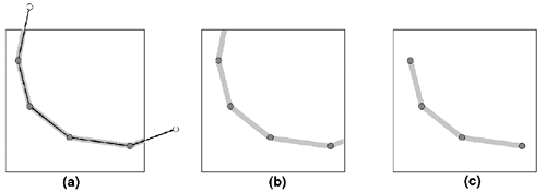 Figure 2: Curve segment inside a sector. In (a), the curve is represented by a thick dark line. Curve vertices are marked as small circles. The sector boundaries are drawn as rectangles. Vertices inside the sector are marked dark, while vertices outside the sector are marked blank. The curve path for the sector is drawn with a thin gray line underimposed to the curve line. Notice that two vertices outside the sector are needed in order to fully specify the curve path. These two vertices are called "off-by-one vertices." With off-by-one vertices, the curve segment can be drawn as in (b). Without them, the curve could only be drawn as in (c).